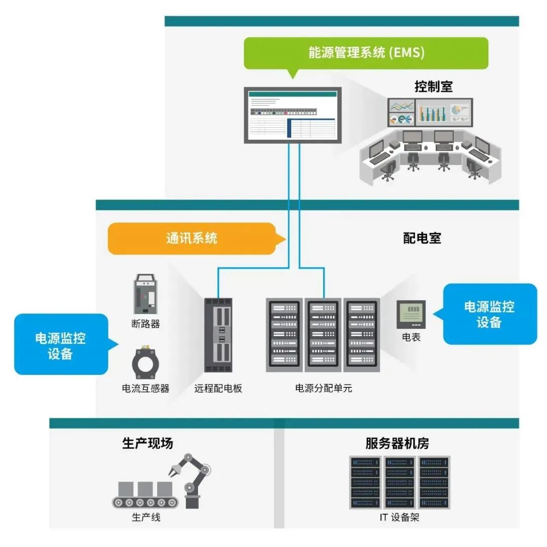 为最大限度发挥监控型 PDU 的优势,能源管理系统 (EMS) 需要收集 PDU 的仪表数据,方便运维人员控制、监测、优化 PDU 的性能。此外,远程电源面板 (RPPs) 可以和 PDU 搭配使用,增加配电容量。因此,必须实时监控断路器和电流互感器,确保不同电路的电源分配稳定可控。